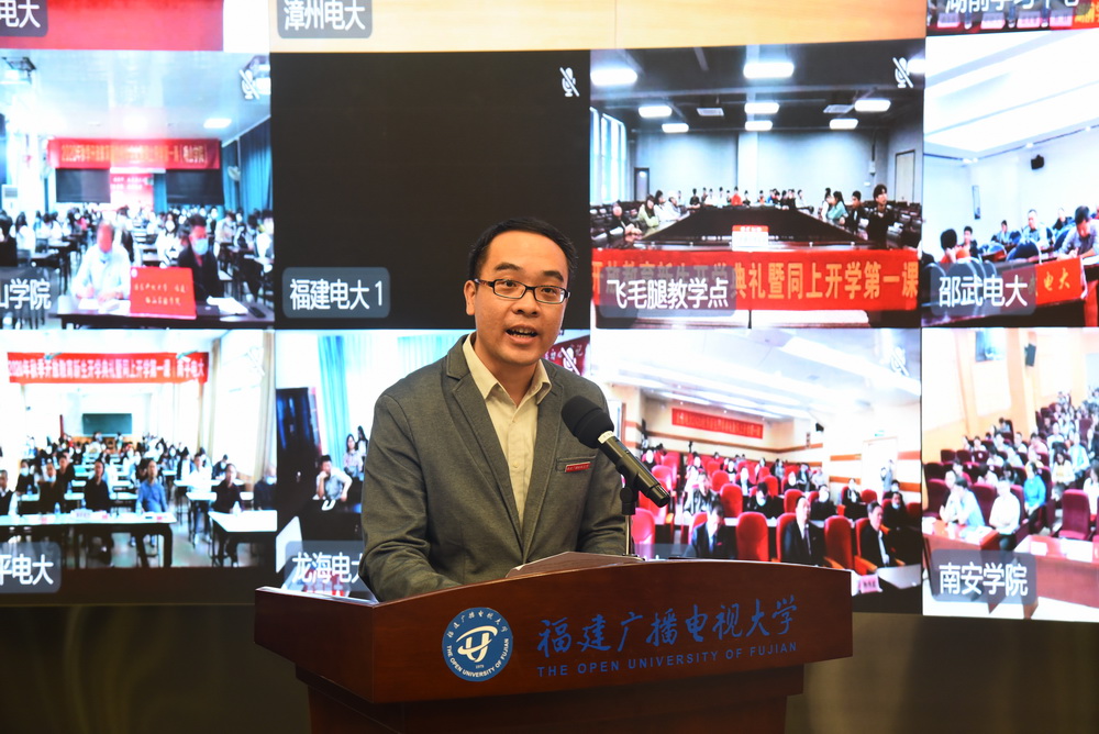 省电大党委书记陈兴炎,党委副书记、校长吴国荣,党委副书记马成斌、纪委书记王幼新、副校长李正光及各地电大领导和师生代表近3000人在主、分会场参加活动。2020年秋季共招收16230人,未到现场新生通过网络直播参加开学式,八闽万生齐聚“云端”,同上开学第一课。马成斌主持开学典礼。